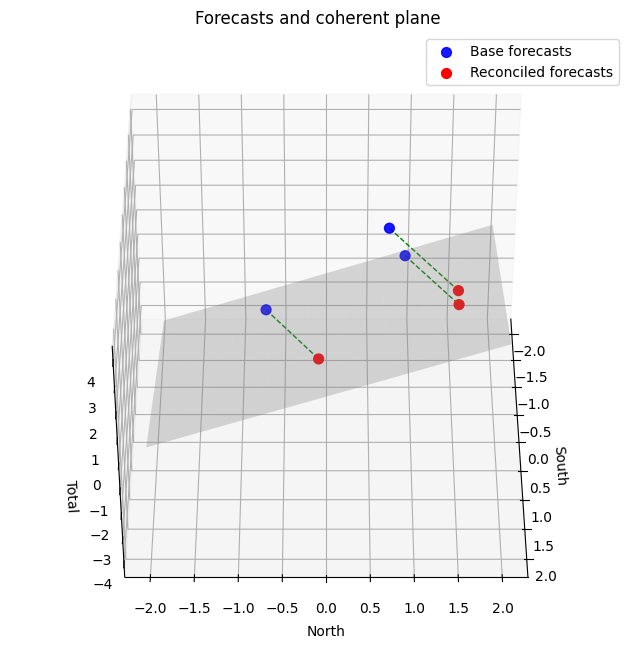 Podemos então projetar nossas previsões iniciais nesse plano para obter previsões coerentes. Essa projeção pode ser feita de várias maneiras, levando a diferentes métodos de reconciliação ótima. Os métodos levam o nome “OLS” pois a projeção é feita minimizando o erro quadrático (Ordinary Least Squares).