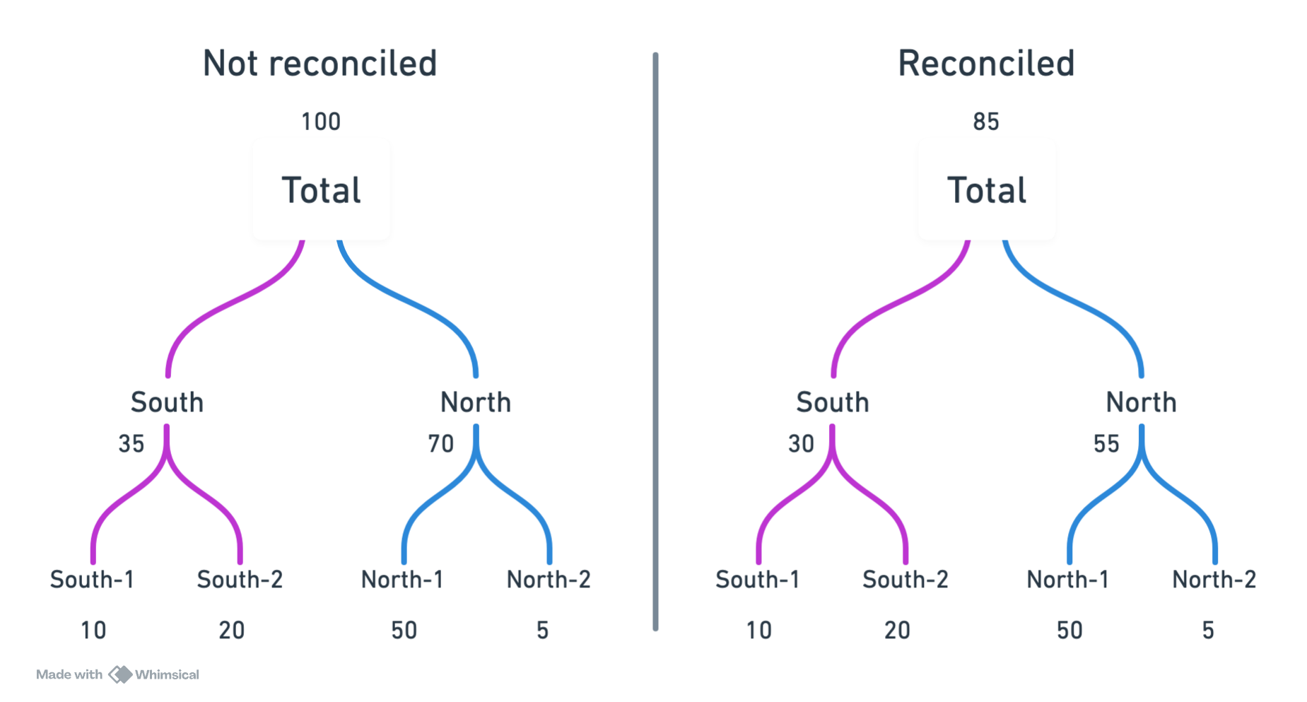 Ao mesmo tempo que dados hierarárquicos são interessantes pois nos trazem mais informação, eles também trazem desafios adicionais. Imagine que queremos prever as vendas futuras de cada produto. Se fizermos previsões independetes para cada produto, não há garantia que a soma das previsões dos produtos será igual à previsão do total da loja. Isso é chamado de incoerência nas previsões hierárquicas. O processo de ajustar as previsões para garantir coerência é chamado de reconciliação.